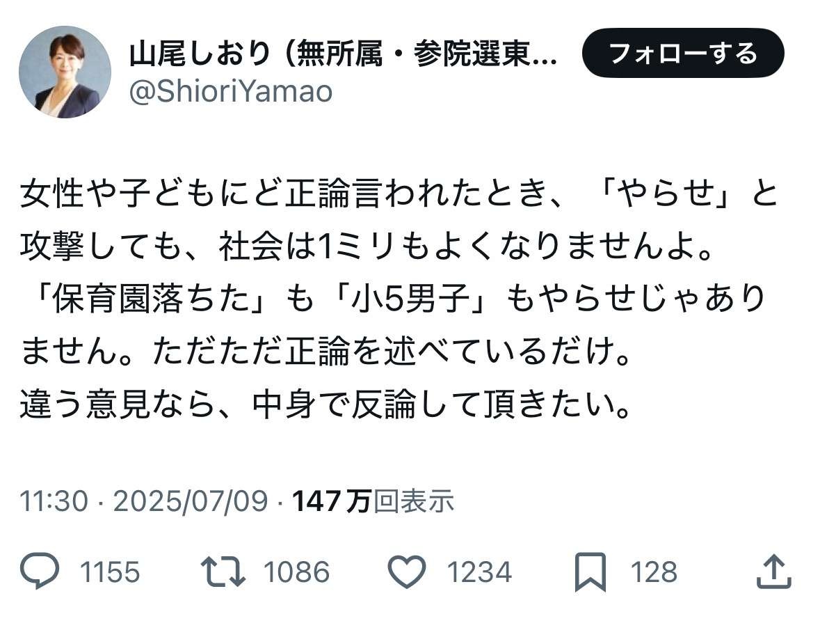 無所属・山尾志桜里氏、小5男子が「女性天皇と選択的夫婦別姓」投稿に猛ツッコミ→「邪推に抗議」と反論も...一転削除(J-CASTニュース) - Yahoo!ニュース参院選(2025年7月3日公示、20日投開票)で国民民主党から公認が見送られ、無所属で東京選挙区から出馬した山尾志桜里氏によるSNS投稿が波紋を広げている。 ■「小5男子がわざわざ来てくれましたnews.yahoo.co.jp