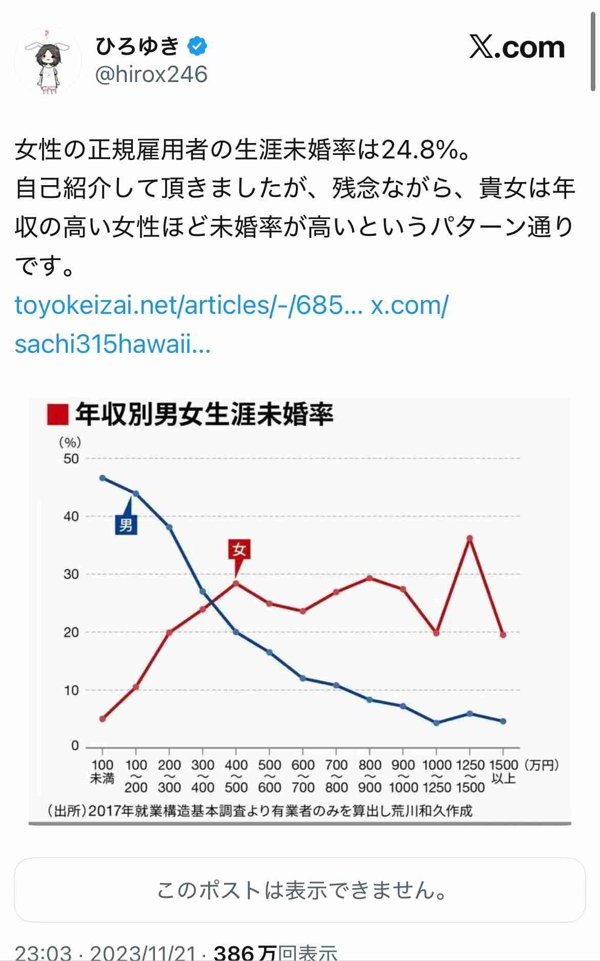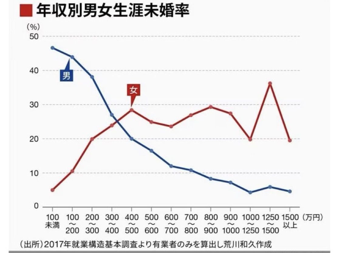 年収ゼロの男女の生涯未婚率の格差がエグすぎると話題にwww女はイージー笑