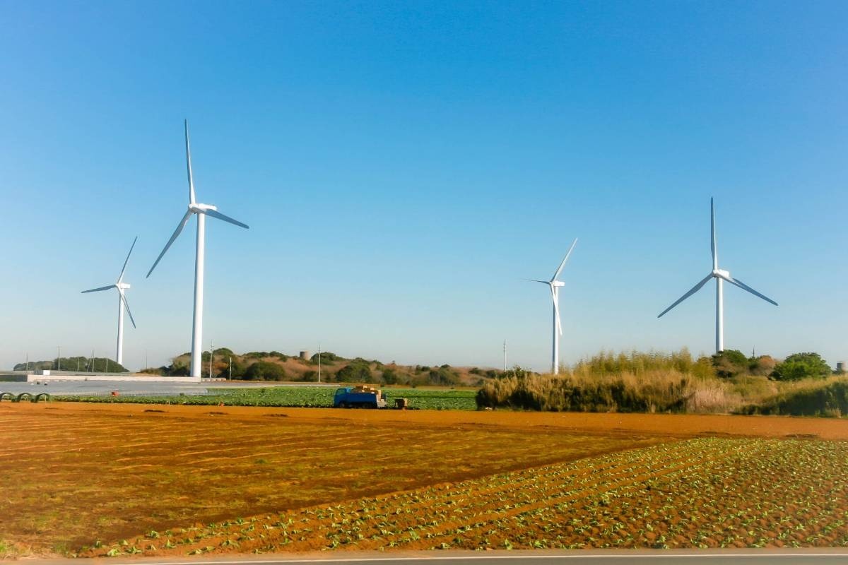 銚子のキャベツ畑、赤土、太平洋、青い空、白い風力発電の風車、断崖絶壁