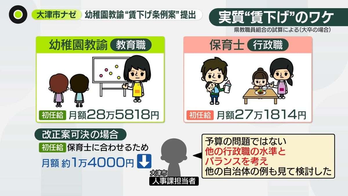 幼稚園の教諭は学校の先生と同じ「教育職」で、県教職員組合の試算によると、初任給は月額28万5818円。一方、保育士は一般事務などと同じ「行政職」で、初任給は月額27万1814円。仮に改正案が可決となれば、初任給は月額約1万4000円下がることになります。