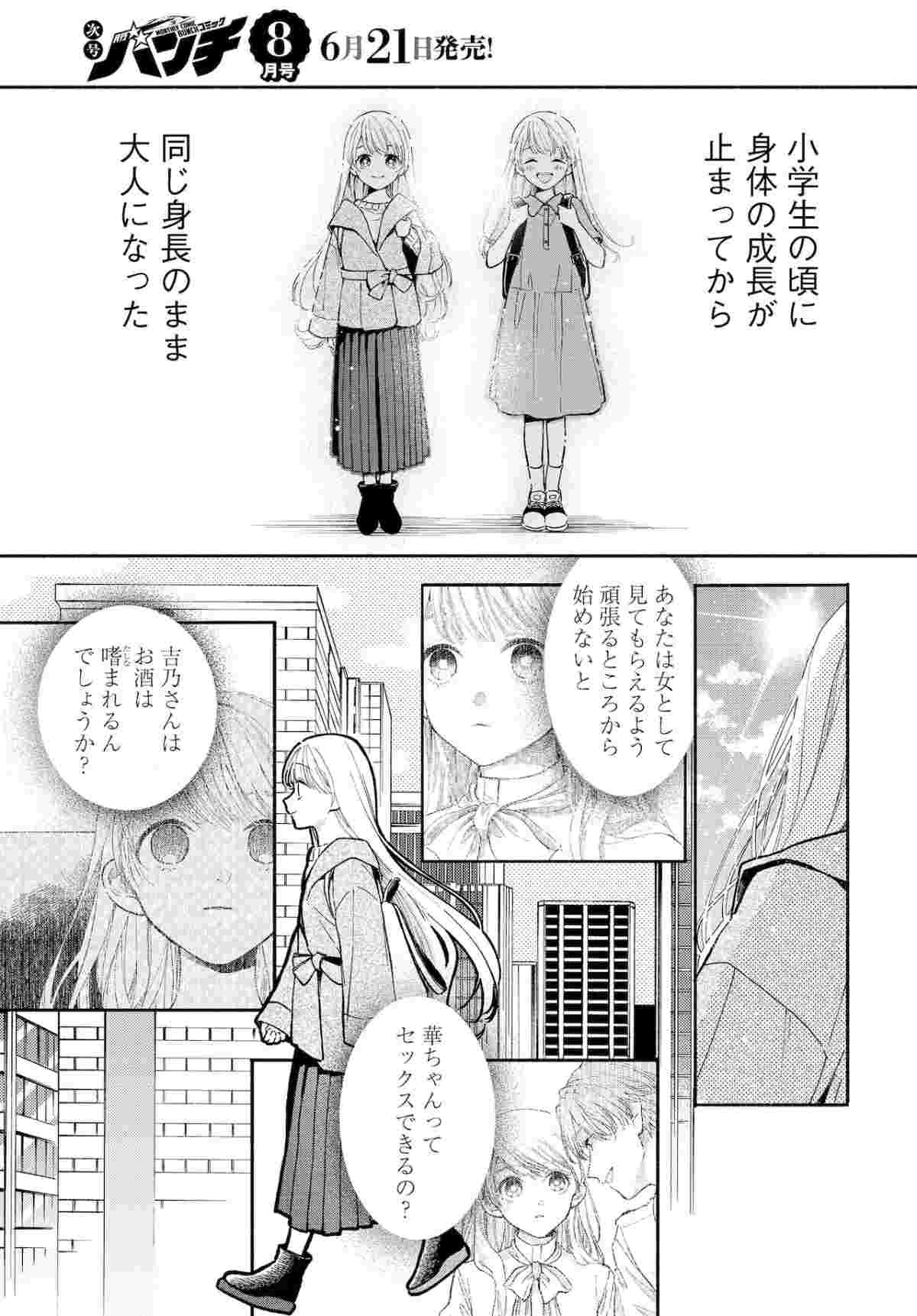 主人公は食品会社に勤める25歳の吉乃華。小学生のときに病気の影響で身体の成長が止まり、身長133cmのまま大人になった華は、外見からの偏見や押し付けを日常的に受けている。恋も仕事も趣味も見た目に縛られ、生きづらい社会ではあるが、華はそれでも戦っていき……。同作は月刊コミックバンチ(新潮社)で連載中。単行本は新潮社初の女性向けマンガレーベルとして新たに誕生したバンチコミックスコラルから刊行された。