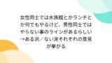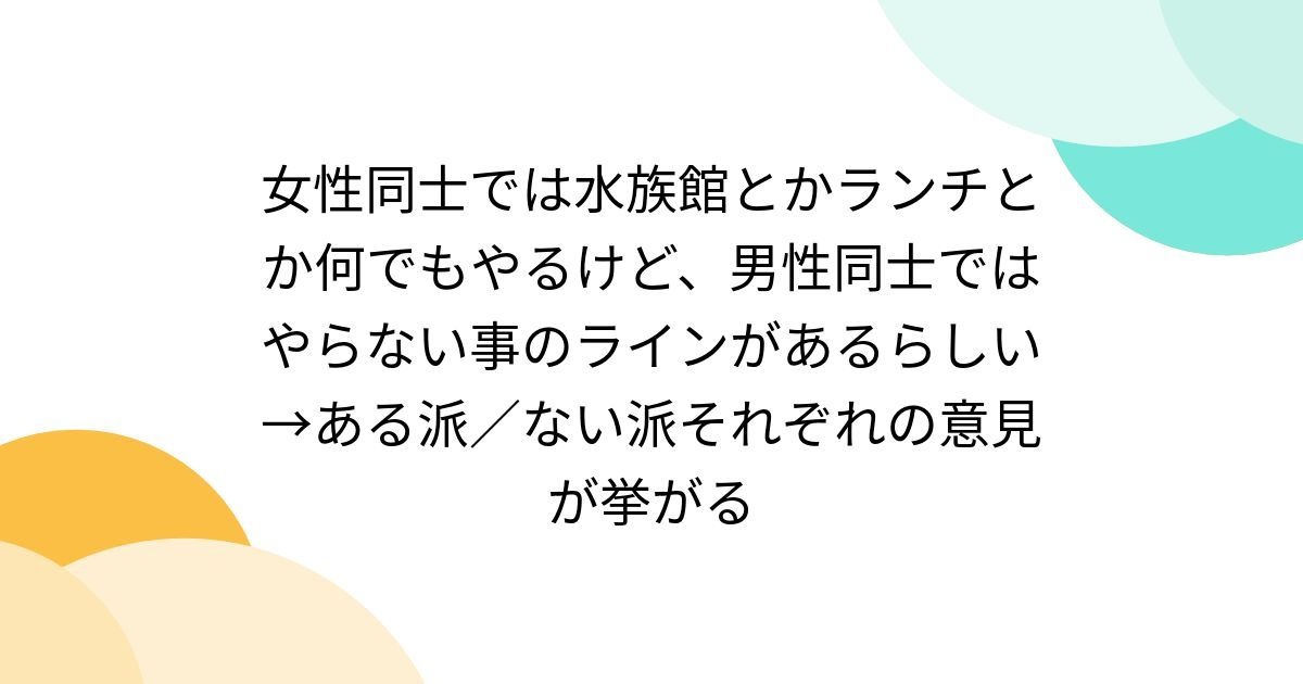 別に男と2人で水族館に行きたいかと言われたら別に行きたくはない 女性同士では水族館とかランチとか何でもやるけど、男性同士ではやらない事のラインがあるらしい→ある派/ない派それぞれの意見が挙がる彼氏と付き合って初めて知ったこと、女の子は女の子の友達と水族館とかランチとか飲みとか何でもやるけど、男は男の友達同士ではやらない(男じゃなくて女の子とやりたい)ことのラインがあるらしい 下北のデッカイ月見に行ったときに「こういうの男とじゃ行かないもんな〜」って言ってた 男同士ではやらないこと、のラインがあるらしいtogetter.com