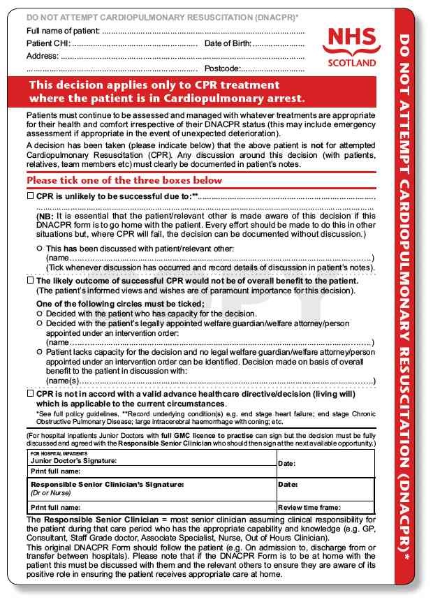 癌の末期、老衰、救命の可能性がない患者などで、本人または家族の希望で心肺蘇生措置(CPR)を行わないこととされる