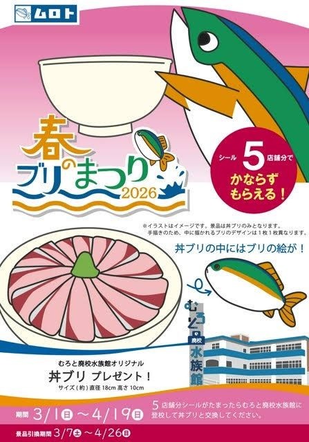 「ヤマザキ春のパンまつり」に寄せ、「ムロト春のブリまつり」と銘打って3月1日から4月19日に開催する。高知ヤマザキを通じて山崎製パンに許可を求めると、「パンでないのなら許可も何も……」と困惑されながらも承認してもらえた。