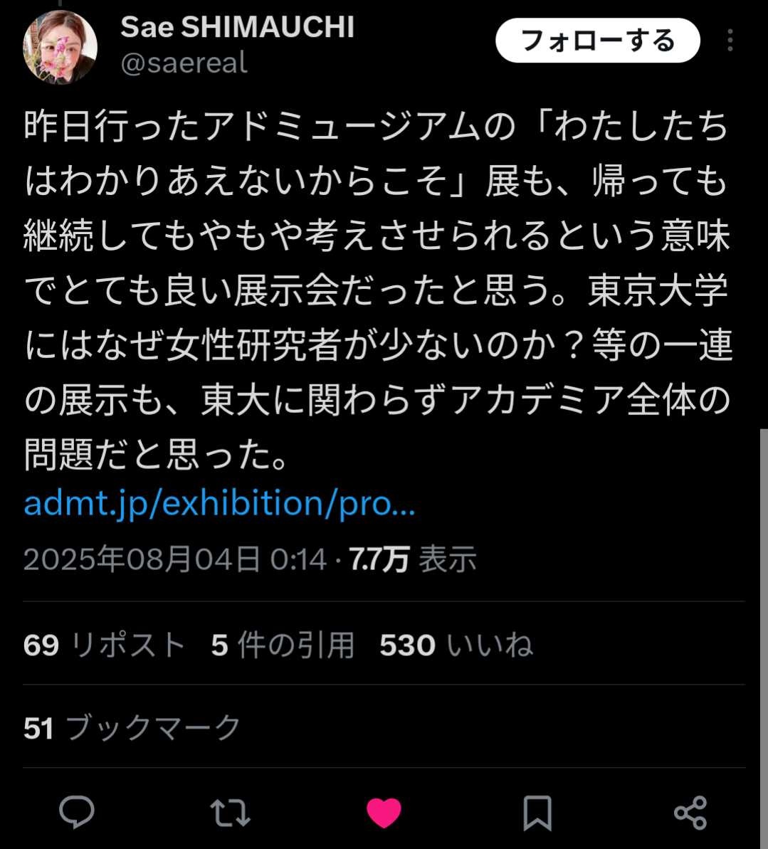 > 東京大学にはなぜ女性研究者が少ないのか?等の一連の展示も、東大に関わらずアカデミア全体の問題だと思った。