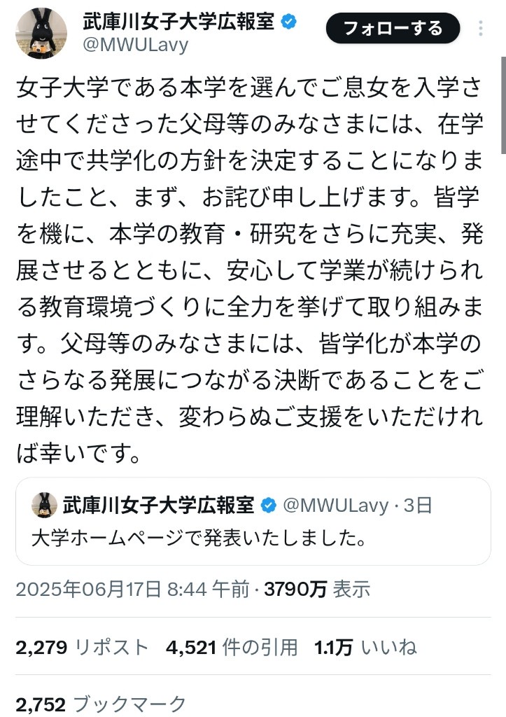 武庫川女子大学、チ●コが入学してくることを謝罪。謝らなくてもいいだろ、そんなにチ●コは汚いのか?