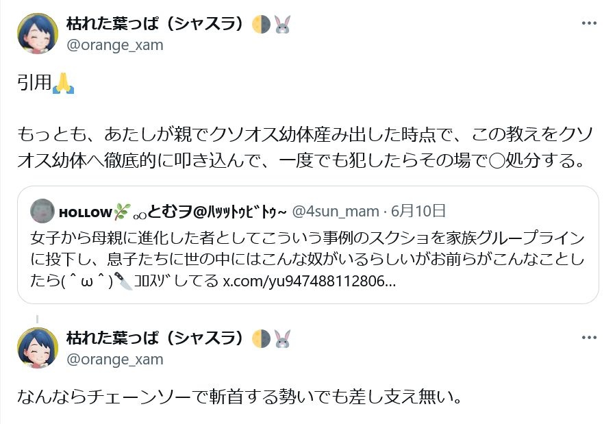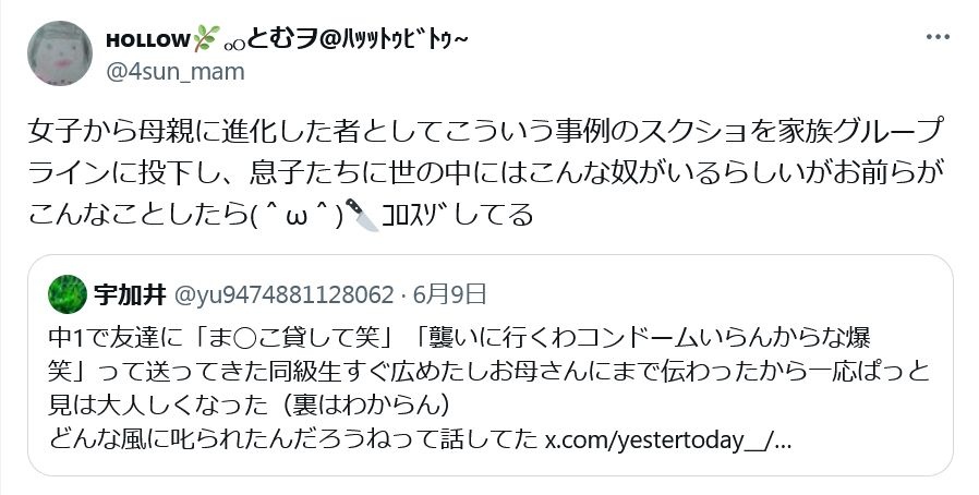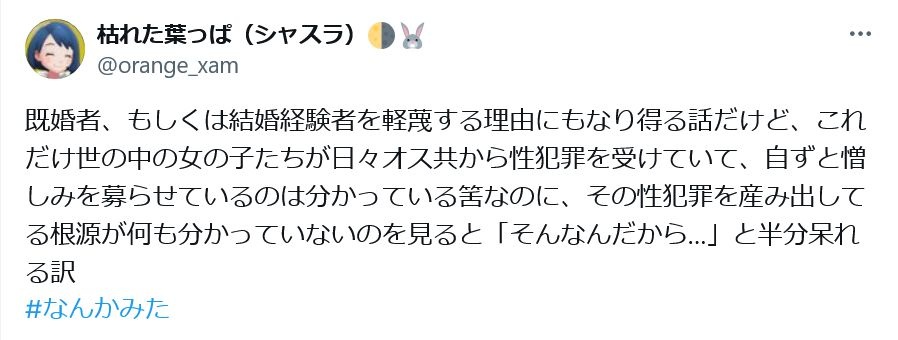 社会や普通に家庭持ってる人間に怨嗟を垂れ流す人間がどういう属性なのか分かりやすいですね