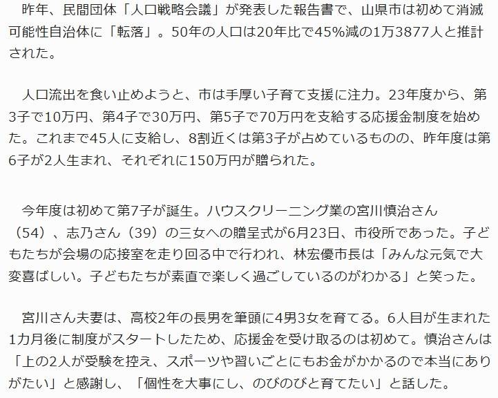 子どもの数に比例して支給額が増える仕組みで第7子以上は310万円。