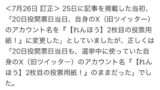 訂正後、この箇所は「公選法では投開票日当日の選挙運動を禁止している。蓮舫氏のアカウント名は、自身への投票を促す事実上の選挙運動に当たるとの指摘がある」に修正されている。
