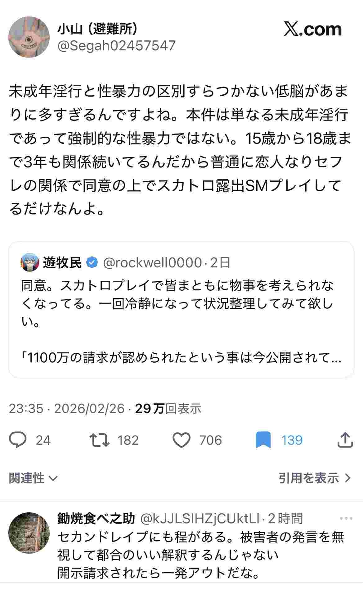 男さん「本件は単なる未成年淫行であって性暴力ではない。普通に恋人なりセフレの関係で同意の上でス●トロ露出SMプレイしてるだけ」