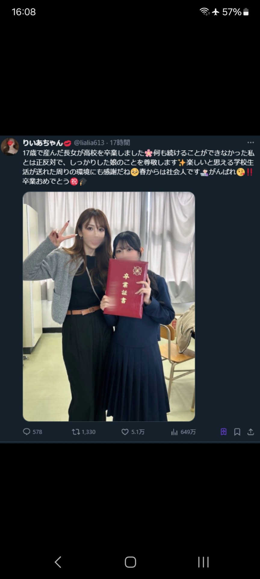 美人母「17歳で産んだ子供が高校卒業した」パシャッ←600万いいね