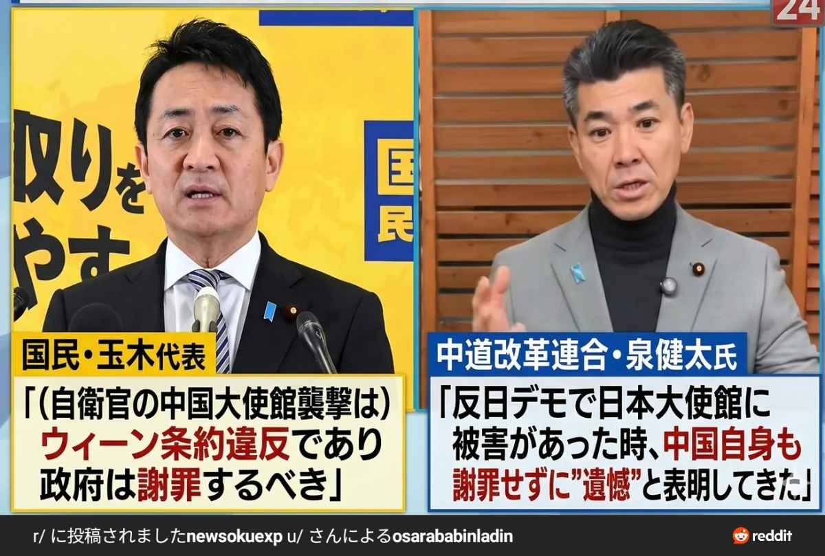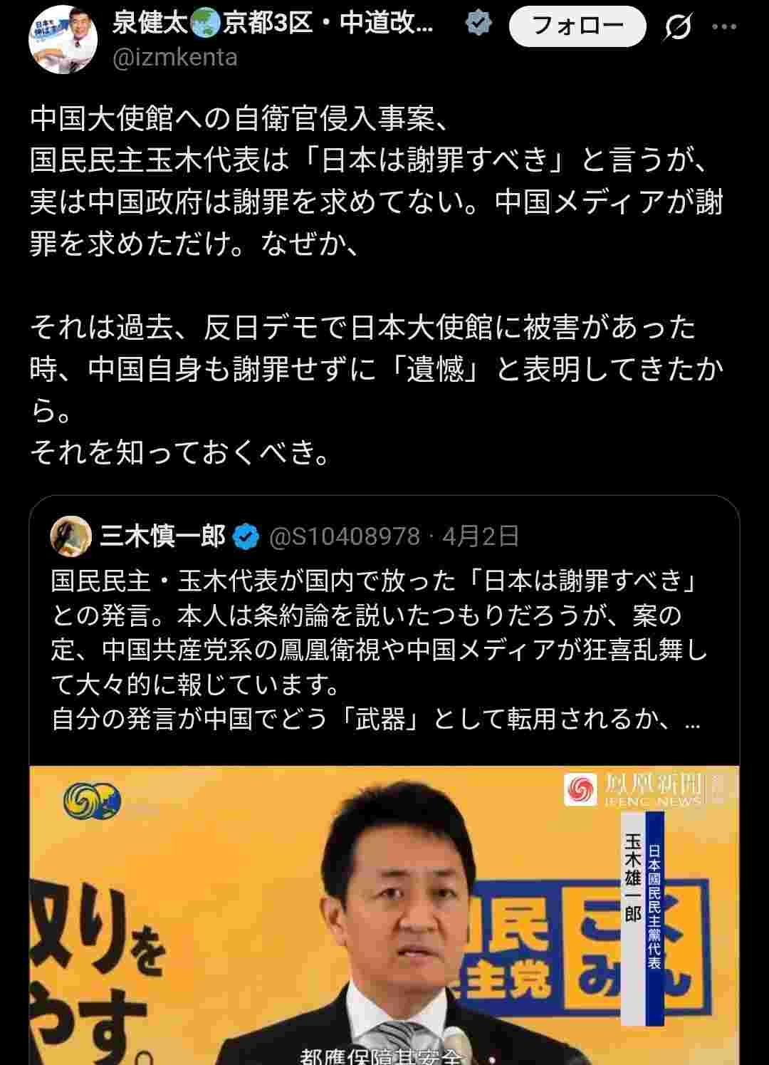 自衛官の中国大使館襲撃、国民・玉木代表「政府は謝罪するべき!」VS 中道・泉健太「謝罪しなくていい😲
