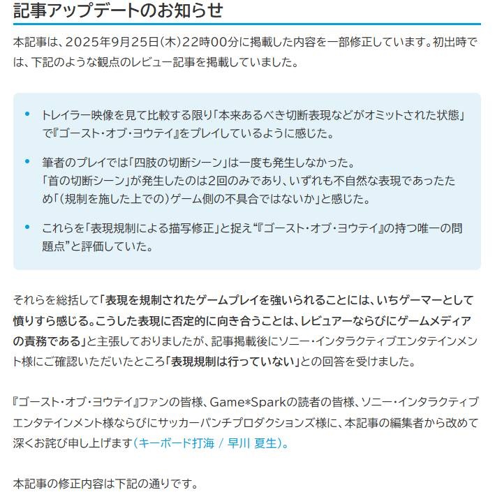 『ゴースト・オブ・ヨウテイ』ファンの皆様、Game*Sparkの読者の皆様、ソニー・インタラクティブエンタテインメント様ならびにサッカーパンチプロダクションズ様に、本記事の編集者から改めて深くお詫び申し上げます(キーボード打海 / 早川 夏生)。