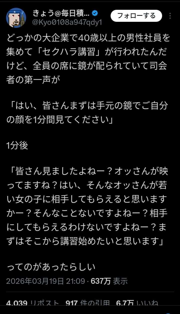 こんな直球の性差別意識に基づいたセクハラ発言をする人たちのやるセクハラ講習になんの意味が?