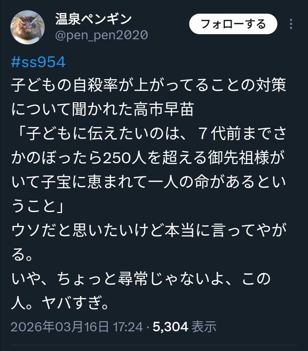 高市総理、子供の自死問題を問われ「七代前までさかのぼれば…」となぜか統一教会の教義を喋るミスを犯す