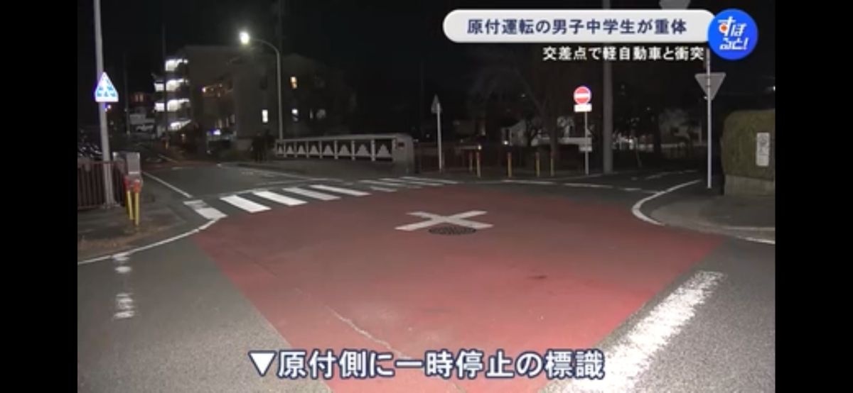 14歳男子中学生が原付バイクを運転…交差点で軽自動車と出合い頭に衝突し意識不明の重体 車は47歳女性が運転