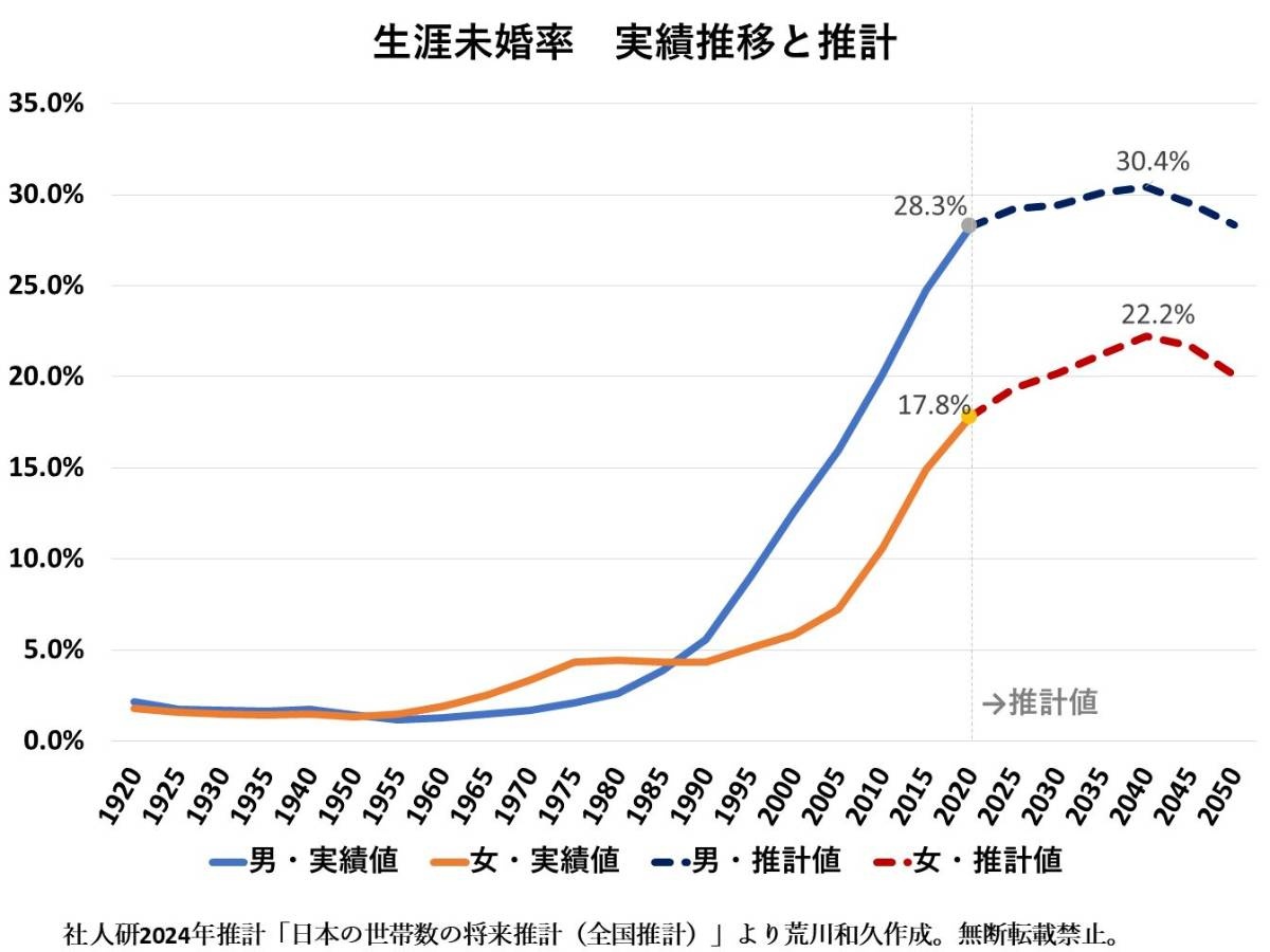 直近の2020年国勢調査(不詳補完値)における生涯未婚率は、男28.3%、女17.8%であった。