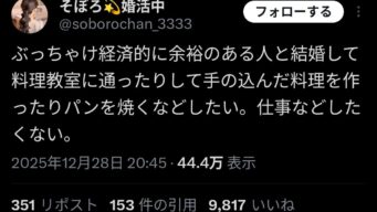 嫌儲 女、ついに本音を漏らす「経済的余裕のある人と結婚して料理教室に通って専業主婦したい。仕事などしたくない」→1万いいね!