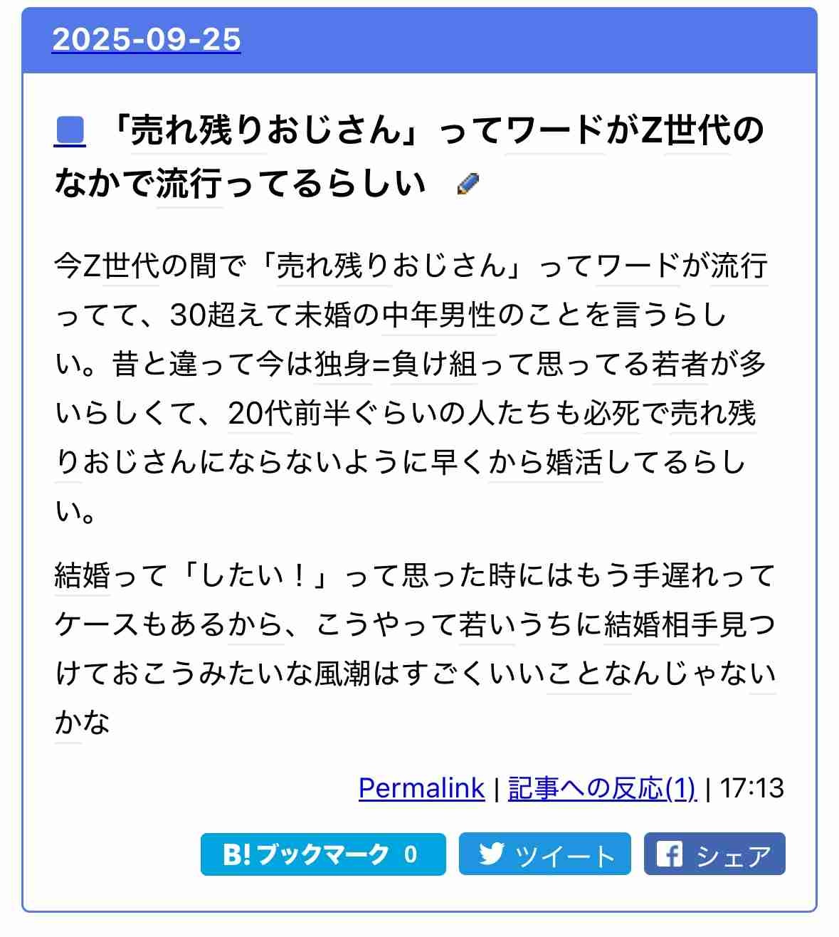 今Z世代の間で「売れ残りおじさん」ってワードが流行ってて、30超えて未婚の中年男性のことを言うらしい。昔と違って今は独身=負け組って思ってる若者が多いらしくて、20代前半ぐらいの人たちも必死で売れ残りおじさんにならないように早くから婚活してるらしい。