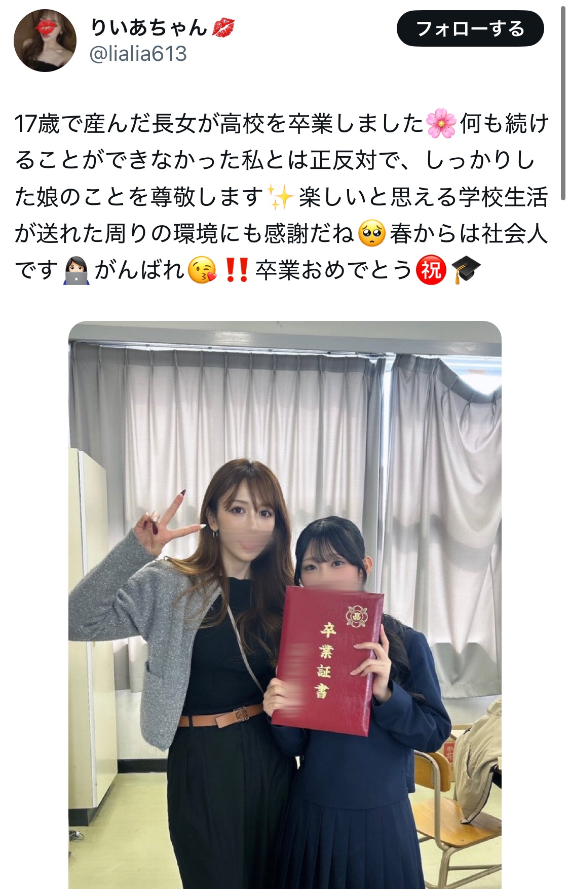 35歳ママ「17歳で産んだ娘が無事に高校卒業しました✨」14万いいね
