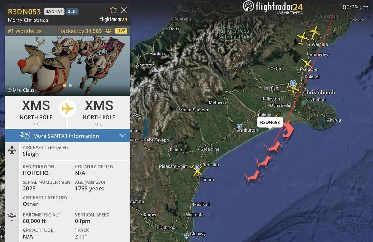サンタのそり、ニュージーランド上空を通過 航空機追跡サイト「フライトレーダー24」が報告