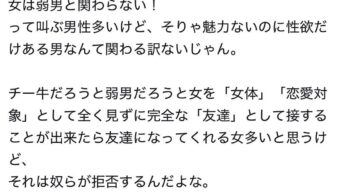 嫌儲 女「チー牛が女を「女体」「恋愛対象」として全く見ずに完全な「友達」として接することが出来たら友達になる女多いけど嫌なんだろ」