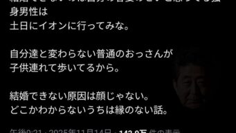 嫌儲 識者「結婚出来ないのは自分の容姿のせいと思っている独身男性は土日イオン行け🫵」