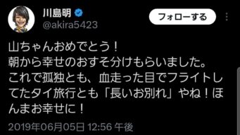 麒麟川島「山里結婚おめでとう!これでタイ旅行ともお別れやね🤗」→今になってポスト掘られ炎上