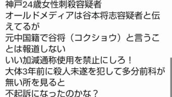 嫌儲 神戸24歳女性刺殺容疑者、犯人の谷本将志容疑者は元中国籍で谷将(コクショウ)と言う帰化人だというデマがXで拡がる