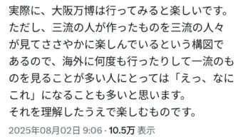 嫌儲 万博アンチ、遂に狂う「大阪万博は三流が作ったものを三流が眺めてひっそりと楽しむド陰キャのカスコンテンツ」⇢炎上、さやママ…