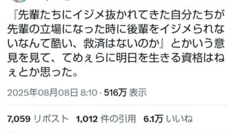 嫌儲 ジャ「先輩たちにイジメ抜かれてきた自分たちが先輩になったら後輩をイジメられないなんて酷い、救済はないのか」