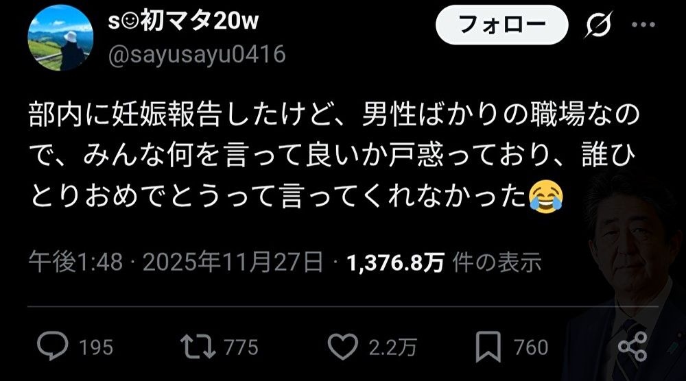 出産報告ならまだわかるんで素直におめでとうが出たんじゃない