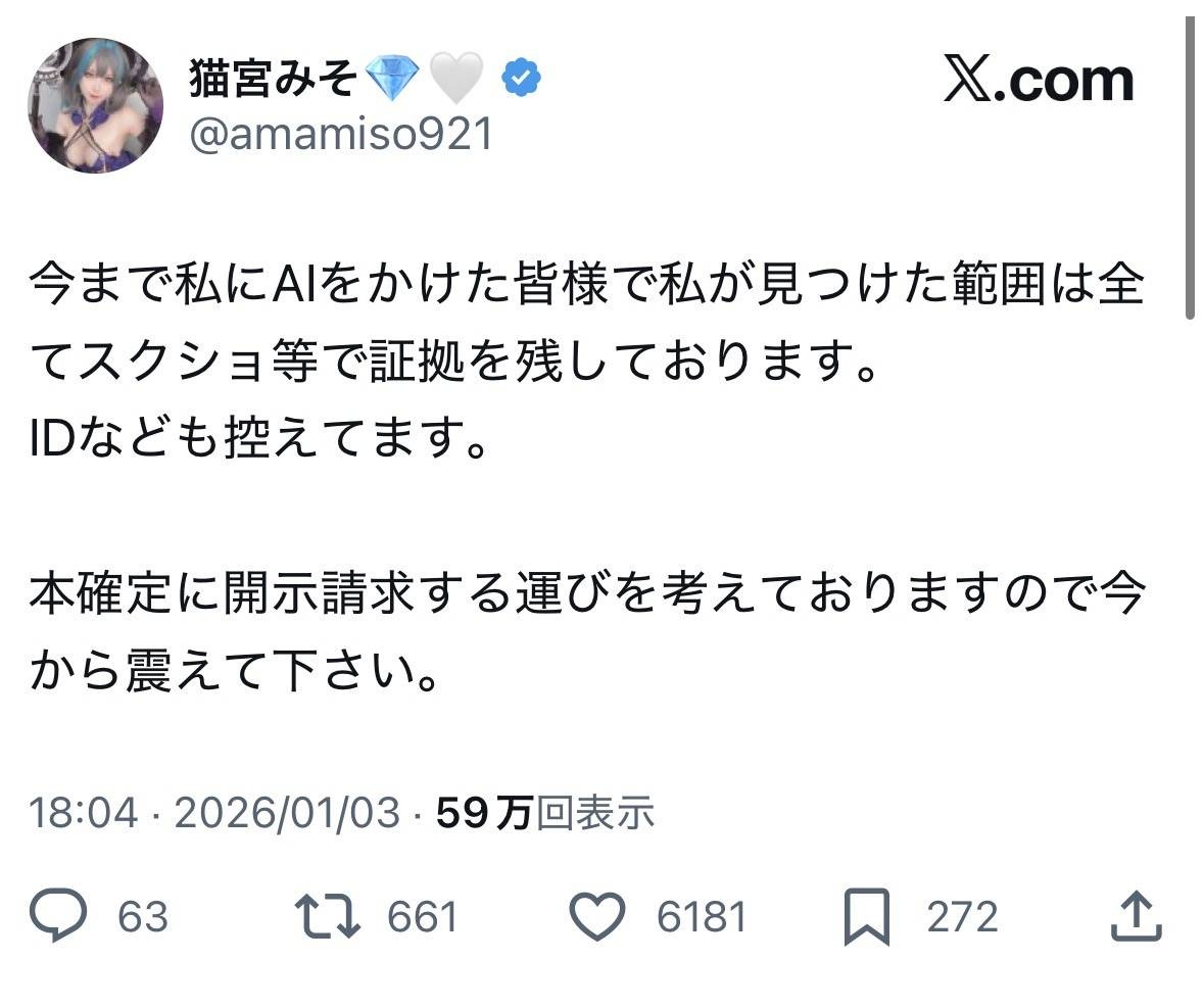 卑猥な画像の拡散者はGrok指示者だけでなくコスプレイヤー自身も対象に含まれるのでは?🤔