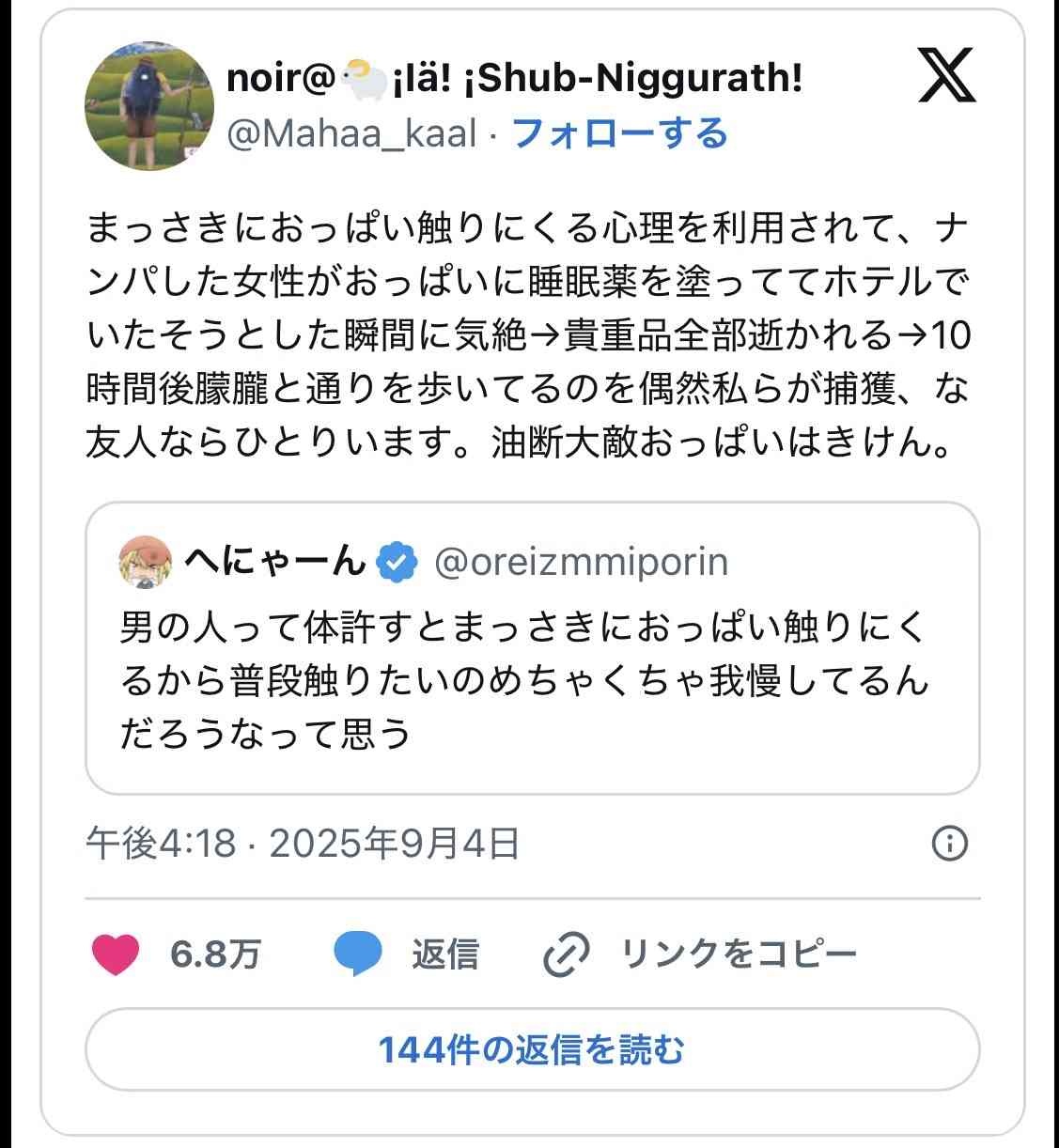X民「待って、友人が『おぱーいに睡眠薬盛った女』と出会って気絶させられた。」←万バズ